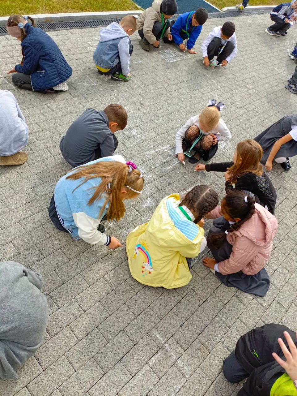 На прошлой неделе ребята участвовали в конкурсе рисунков на асфальте «Школьные дни». Посмотрите, какая красота получилась! Ребята объединились в команды, придумывали общие идеи и творили вместе.