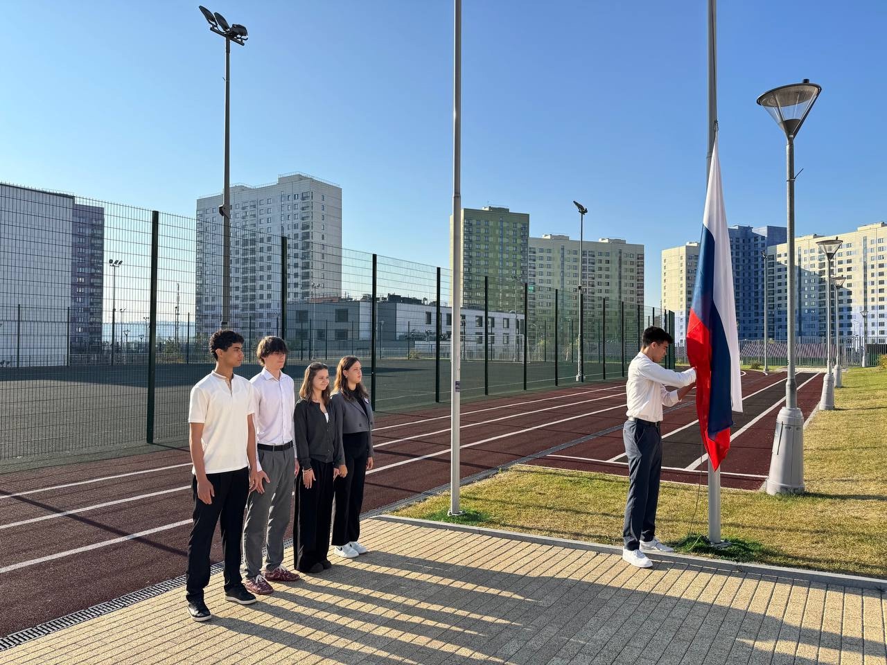 Сегодня утром на школьном дворе прошла торжественная церемония поднятия Государственного флага Российской Федерации — традиционное событие, которое задает настроение всей учебной неделе.
