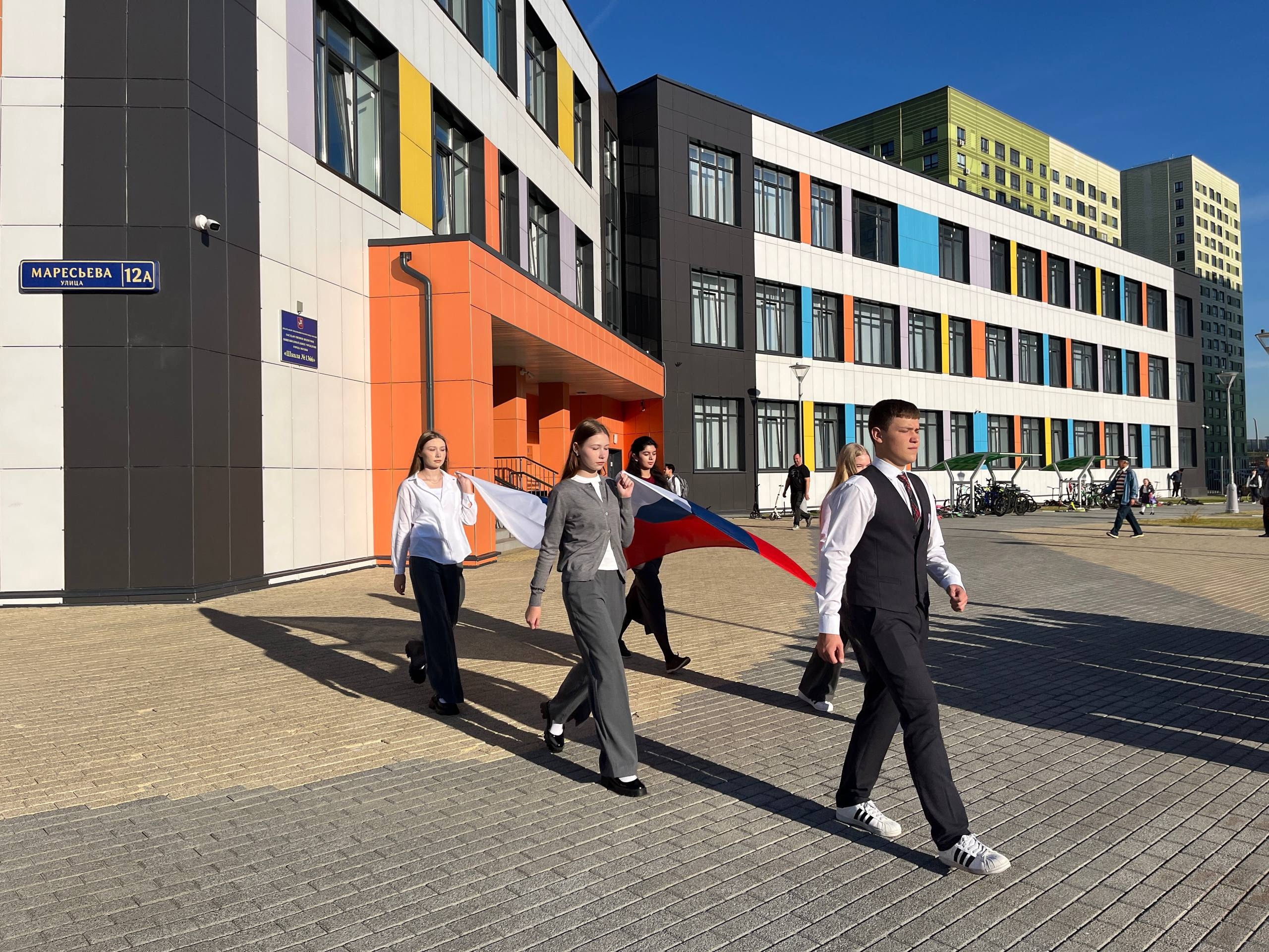Почётное право вынести и поднять Государственный флаг Российской Федерации было доверено нашим лучшим ученикам 10 «А» класса. Ребята показывают отличные результаты в учёбе и активную жизненную позицию. Мы гордимся нашими старшеклассниками — они подают прекрасный пример младшим товарищам!